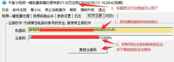 4. 运行后,点“软件注册”,把机器码复制并发送给我们,我们会把注册码发给你,只要把注册码复制到软件里,点“更新注册码”,即可完成注册
